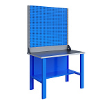Верстак комплектуется полкой-стенкой, расположенной под столешницей для удобного размещения габаритного инструмента и оснастки. Опорные элементы выполнены сварными из холоднокатаной стали. Все металлические элементы покрыты полиэфирной порошковой краской. Столешница из фанеры толщиной 24 мм, которая покрыта листом оцинкованной стали толщиной 1,2 мм. Глубина столешниц 696 мм. Максимальная масса груза на столешнице - 350 кг.