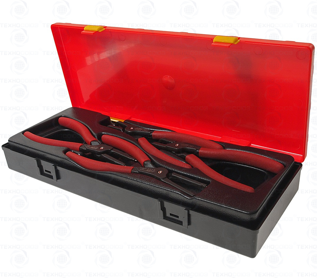 Набор съемников стопорных колец (клещи) (4 предмета) в прочном презентабельном боксе. Изготовлено из хром-ванадиевой стали, что обеспечивает высокую прочность и жесткость инструмента.