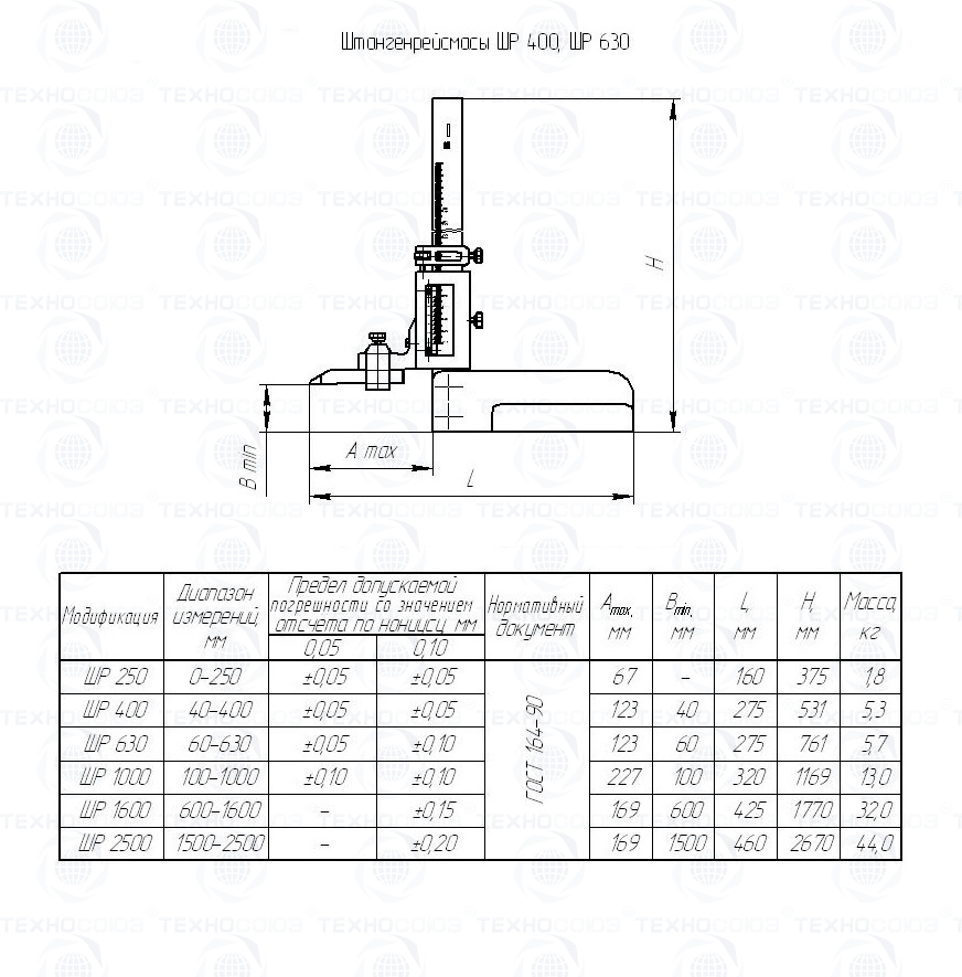 Пример условного обозначения штангенрейсмаса с диапазоном измерения от 0 до 250 мм и значением отсчета по нониусу 0,05 мм - Штангенрейсмас ШР-250-0,05 ГОСТ 164-90.
