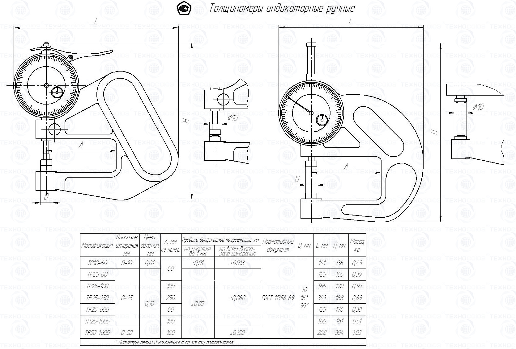Пример условного обозначения настольного толщиномера с диапазоном измерения от 0 до 10 мм, с вылетом 60 мм, с нормированным измерительным усилием - Толщиномер ТН 10-60 ГОСТ 11358-89.