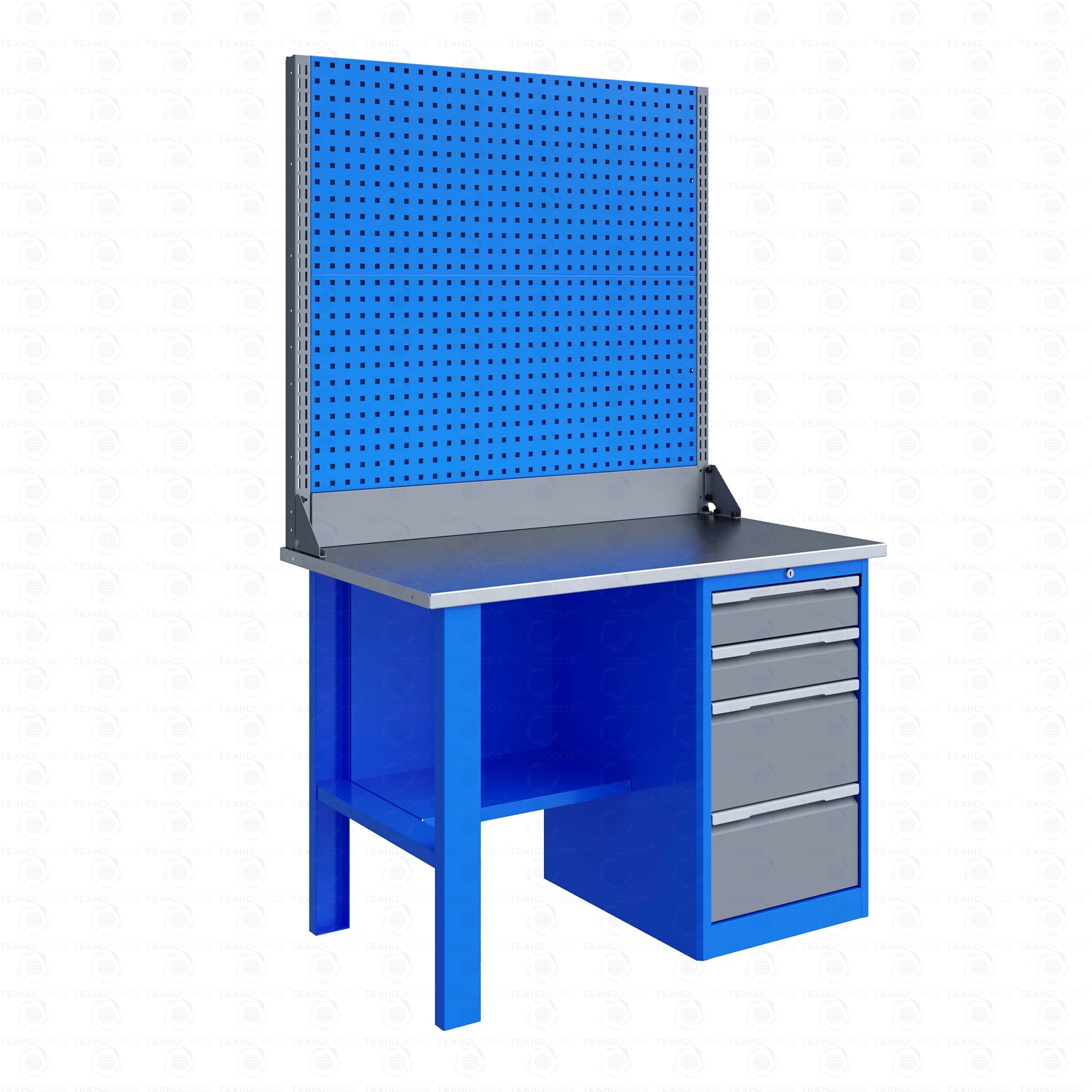 Однотумбовый. Допустимая нагрузка на столешницу 750 кг. Опорные элементы выполнены сварными из холоднокатаной стали. Верстак состоит из столешницы, опоры, тумбы P4 с двумя малыми и двумя большими ящиками, полки-стенки, двойного экрана с кронштейнами. Все металлические элементы покрыты полиэфирной порошковой краской. Столешница из фанеры марки ФСФ толщиной 24 мм, которая покрыта лаком-антисептиком и листом оцинкованной холоднокатаной стали толщиной 1,2 мм. Размеры (ВхШхГ) 1965x1196x696 мм.