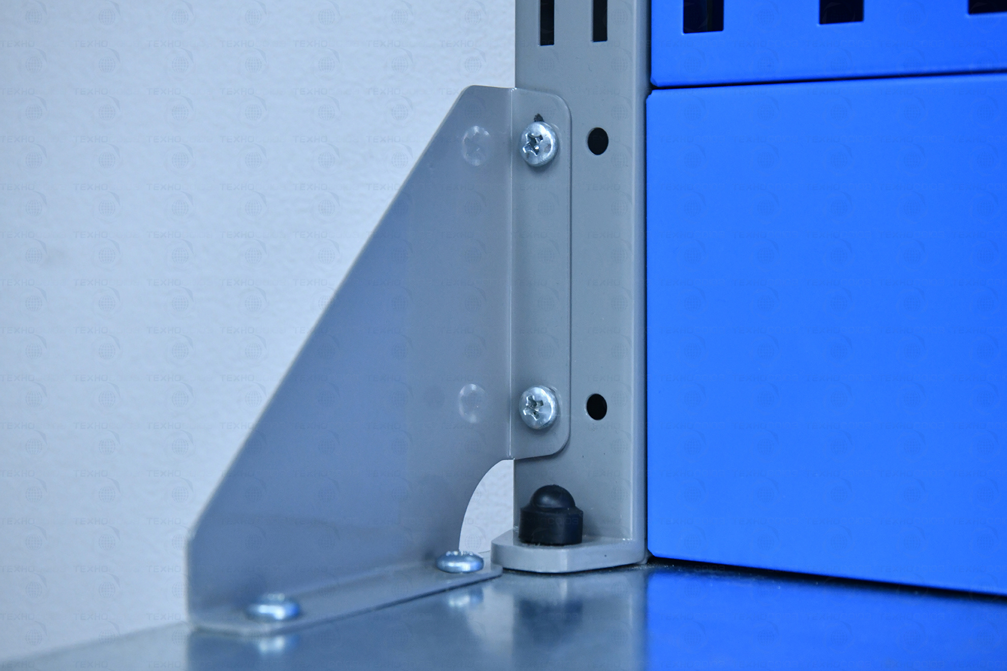 Тумба верстака - сварная.В тумбе P7 установлено две полки. Полки устанавливаются на парах специальных формованных зацепов, выполненных в боковых стенках тумбы. Имеется возможность смены стороны открывания двери. Дверь тумбы снабжена центральным замком с поворотом ригеля 180 градусов. В комплекте имеется два ключа.